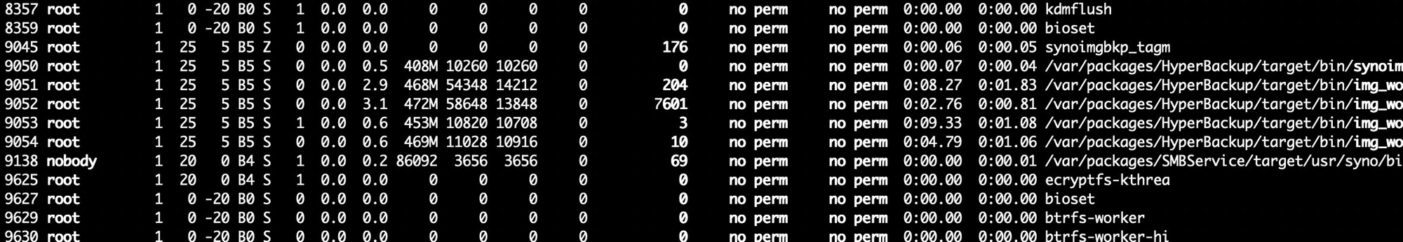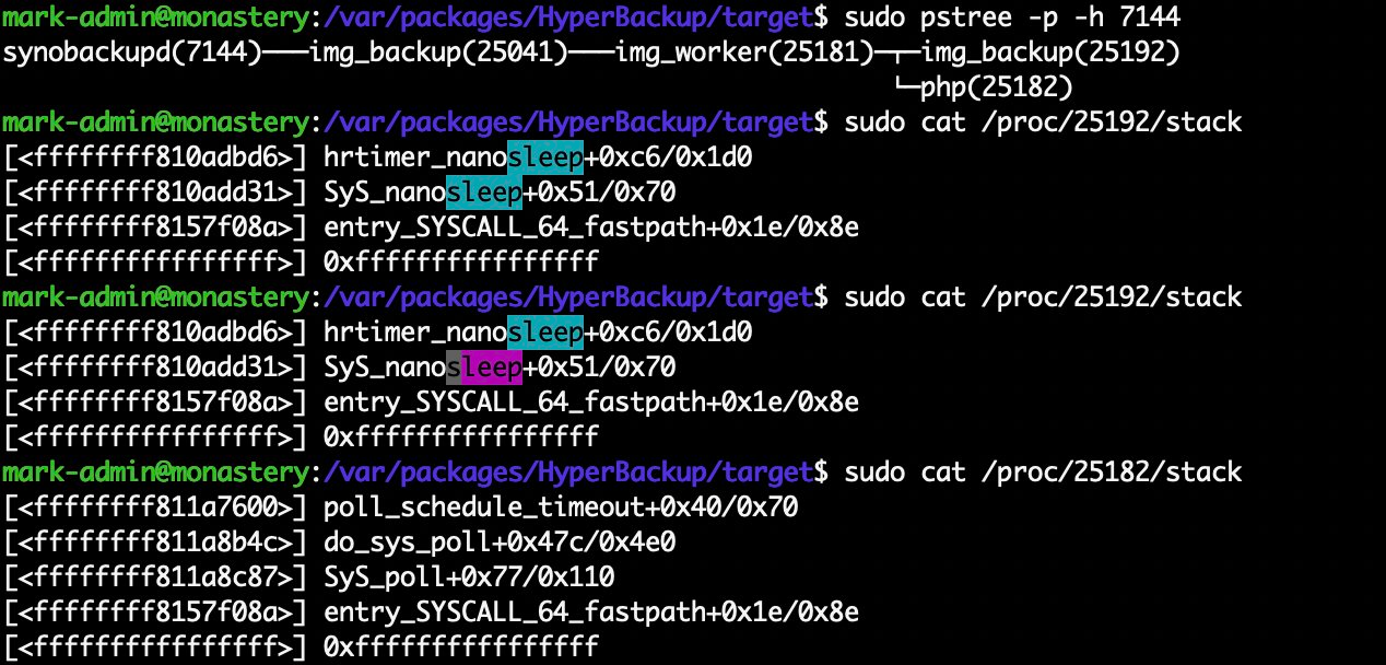 So I wonder, what the heck is Synology Hyper Backup doing? I don't have the linux-perf-tools profiler installed, but I have "poor man's perf", looking at the kernel stack of the threads: cat /proc/$pid/stack. First I find the pid using pstree, with -p to show pids, we see that synobackupd is the root job, spawning img_backup which spawns img_worker which spawns img_backup and php.