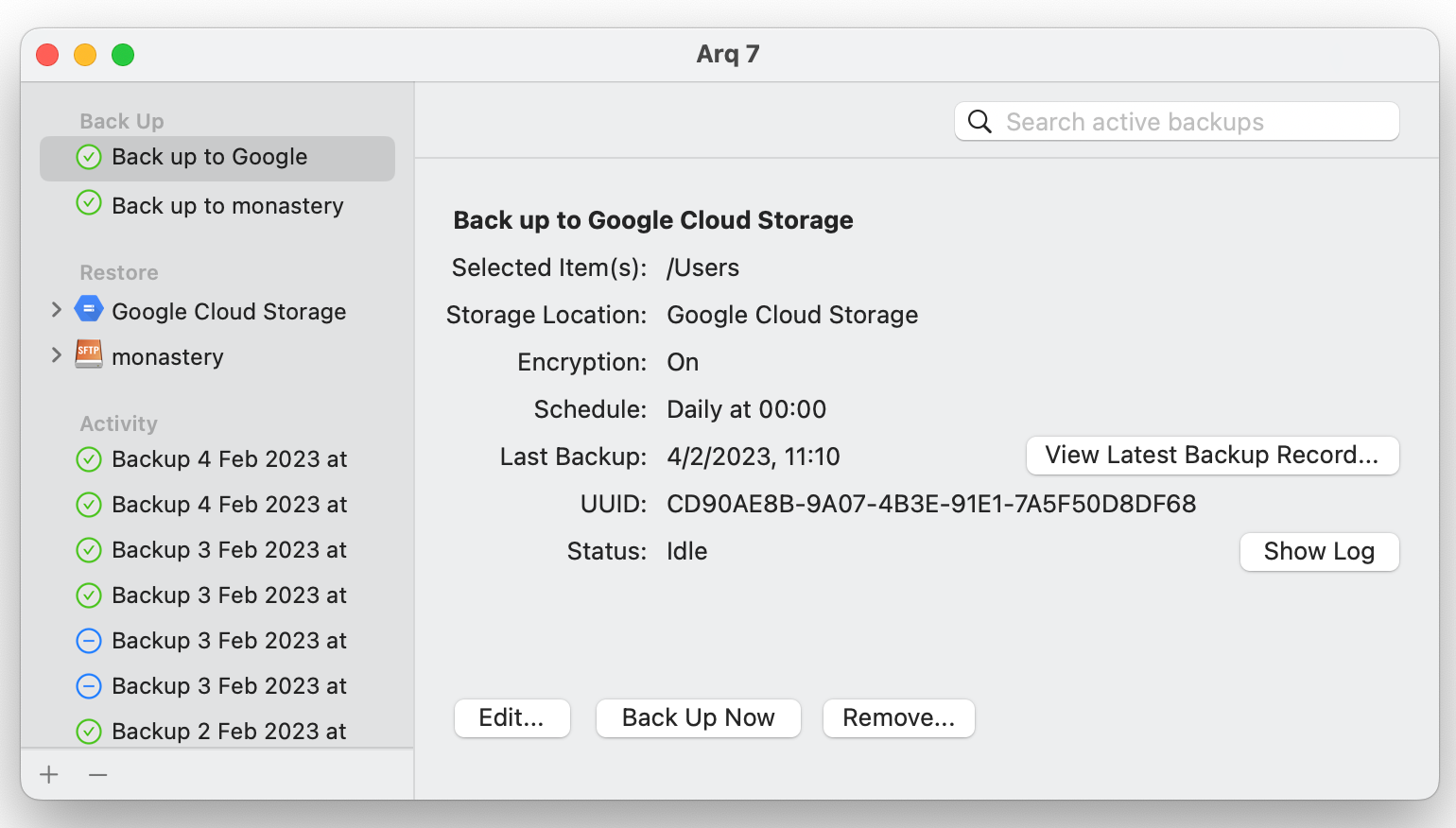 But my big files that live only on the Synology NAS (mostly disk images taken from disks inherited from a deceased estate) were only "synced" to Google Cloud Storage, by Synology Cloud Sync. Cloud Sync is not revisioned – only the latest version is kept, so a corrupted source would overwrite the sync. So, not really backups! Time to re-evaluate cloud backup software. I'm looking for software that will run on the NAS (Linux, Synology), at a reasonable cost for 1TB of backups, client-side encrypted, maybe with a year's worth of version retention.