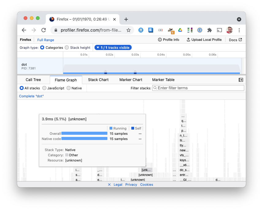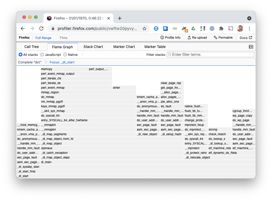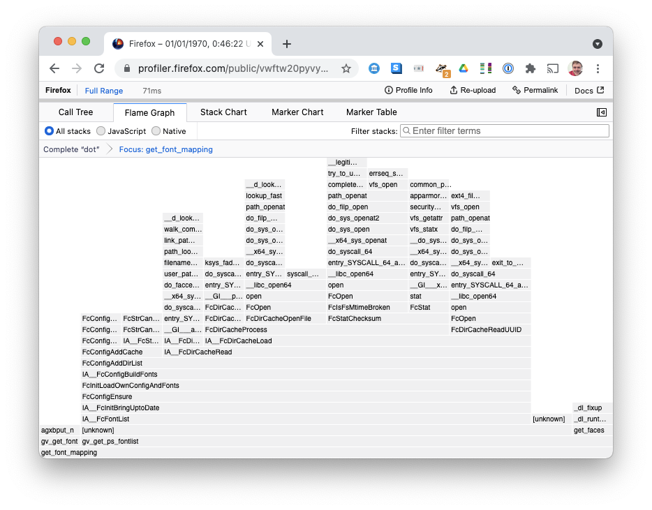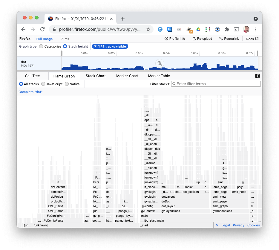Then convert the output, filtering to only processes with command-line equal to dot (to get rid of perf profiling itself), outputting to a txt file with PIDs as per the instructions for importing perf profiles into Firefox Profiler: