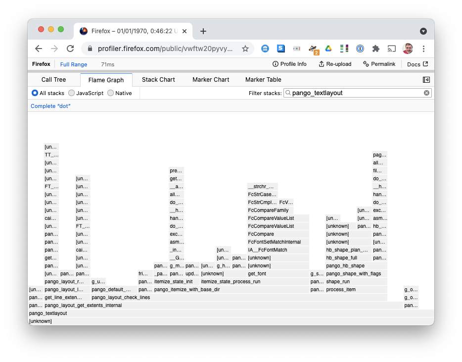 libfontconfig1-dbgsymAfter installing symbols, the profile started showing function names for many libraries. But I still had the 'root' of the stack having a lot of [unknown] symbols: